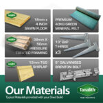 • 18mm Floor board pressure treated tanalised planks consisting of floor bearers attached underneath to elevate off the ground