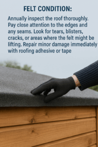 Felt Condition: Annually inspect the roof thoroughly. Pay close attention to the edges and any seams. Look for tears, blisters, cracks, or areas where the felt might be lifting. Repair minor damage immediately with roofing adhesive or tape.