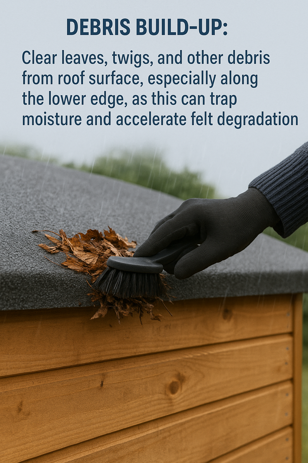 Debris Build-up: Clear leaves, twigs, and other debris from the roof surface, especially along the lower edge, as this can trap moisture and accelerate felt degradation.